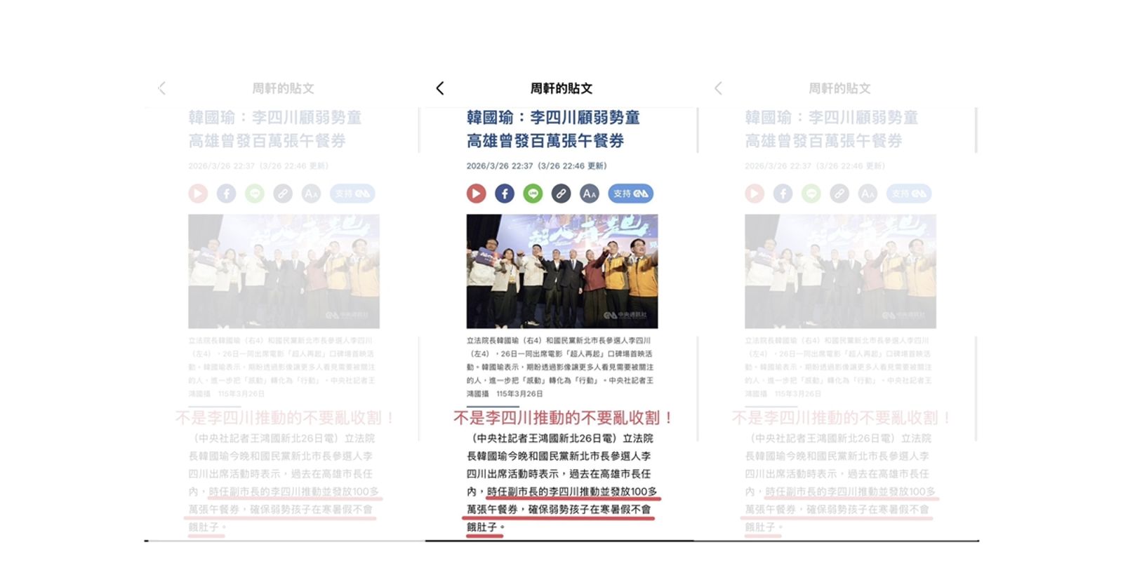 周軒表示,韓國瑜再度施展他的家傳絕學,乾坤大挪移。韓國瑜昨天說,他在高雄市長任內,推動兒童寒暑假營養午餐券是「李四川推動」的,但其實這項政策是陳菊時代推動的 。